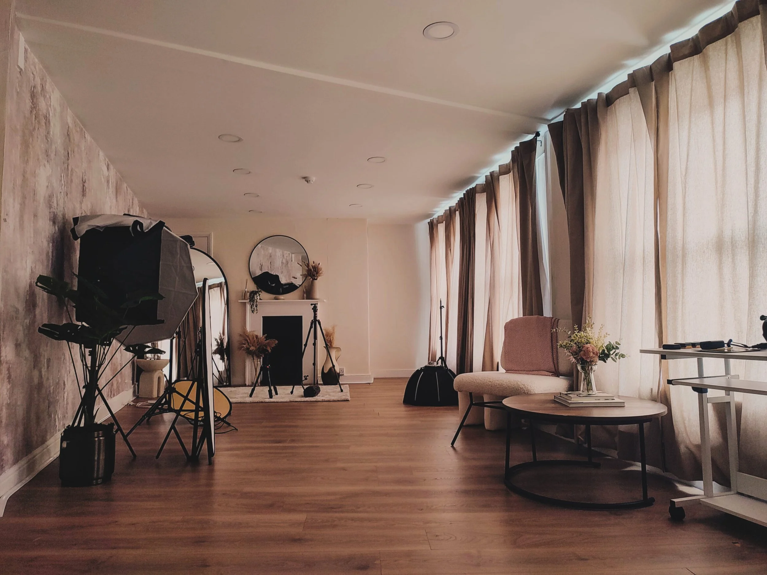 Phos is where storytelling begins with light. Designed for creators who see the world through a cinematic lens, this studio space is bathed in natural tones and equipped with professional lighting and gear to shape mood, depth, and emotion.